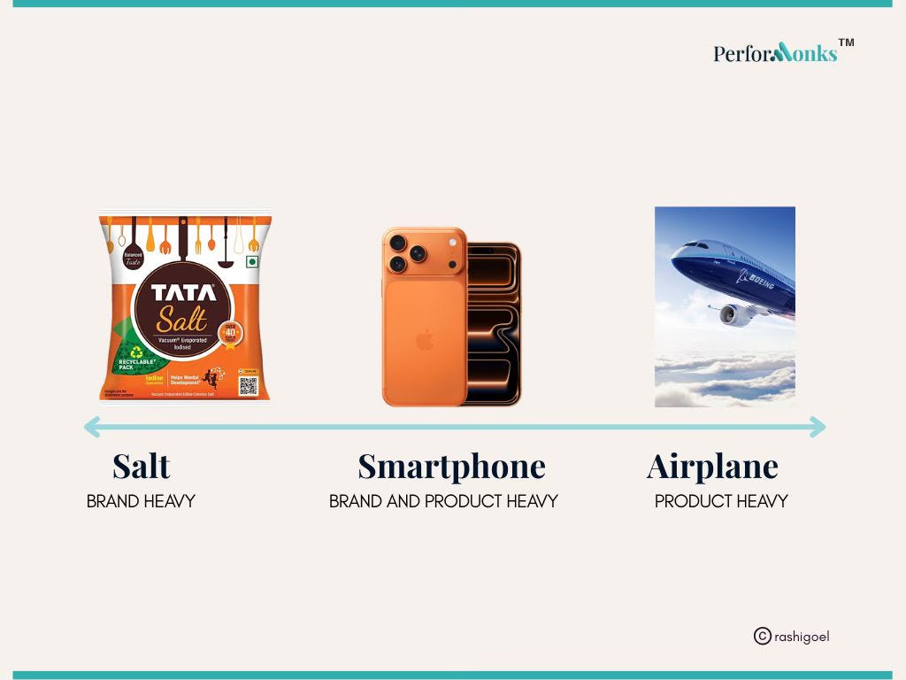 The spectrum runs from categories where the brand is the product (salt, bottled water, sugar) to categories where the product’s complexity gives it real weight alongside the brand (aeroplanes).